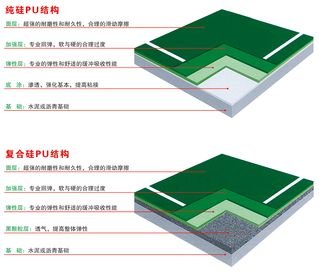 环保型硅PU系新发展的环保球场弹性材料,由德国引进。材料组成为水性有机硅弹性分散液和水性PL液为基础树脂,配合骨料、填料、色浆、微细硅纤维及其他添加剂组成。